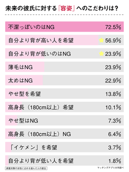 一方で「イケメン希望」は3.7%にとどまる結果で、男性の「顔」への関心は低いことが分かりました。