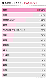 この3つの回答以外では、4位が「収入」で9.2%。そのほか、「容姿」「職業」は0.9%、「学歴」は0で、外見やスペック的な面を挙げた人はごくわずかという結果でした。