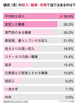 実際の彼氏(夫)に関しても、「平均的な収入」「安定した職業」の男性を選んでいる女性が多い結果です。
