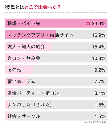 彼氏と出会った場所について、1番多かった「職場やバイト先」は他の年代でも上位となる定番の出会いの場ですが、「マッチングアプリ・婚活サイト」が16.9%で2番目にイチしている点に注目したいところです。