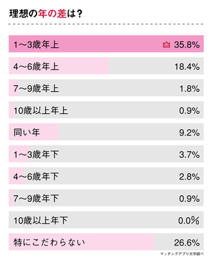 一番多いのは「1~3歳年上」です。「年下」を理想とする人は総じて少ない結果で、自分の年齢が上がったからといって年下がターゲットになる女性は少ないようです。