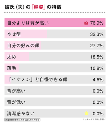 実際に40代で彼氏(夫)ができた人に、彼氏(夫)の容姿について聞いたところ、「清潔感がない」と回答した人は「0人」でした。「背の高さ」では、「自分より背が高い」が76.9%に上っており、希望とほぼ合致しています。