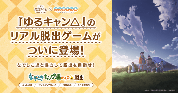 株式会社SCRAP(本社:東京都渋谷区 代表:加藤隆生)は、現在劇場版が絶賛上映中の大人気アニメ『ゆるキャン△』とコラボレーションした、オンラインで遊べるリアル脱出ゲーム『なぞときキャンプ場からの脱出』を本日2022年7月20日(水)より先行予約(早割)販売いたします。