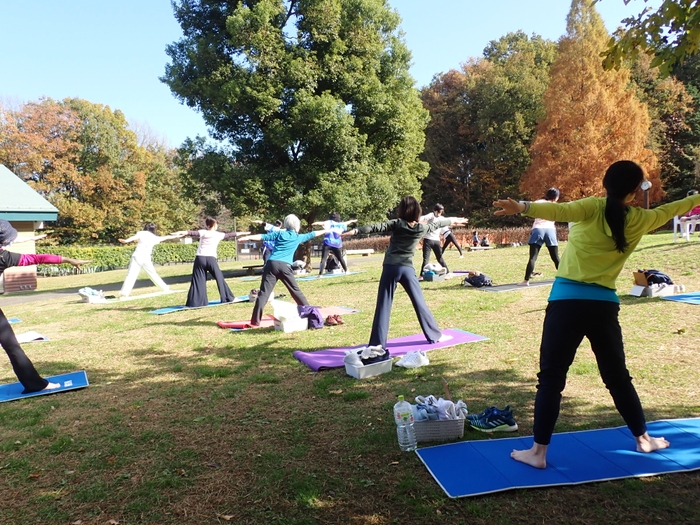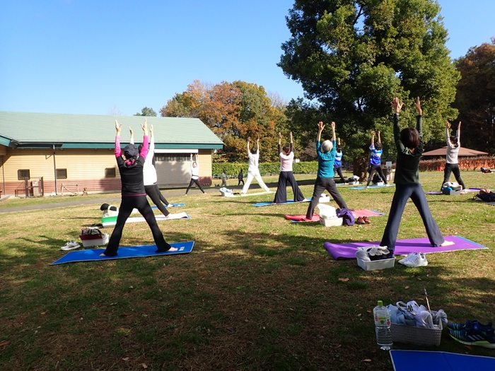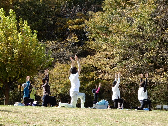 緑豊かな小山内裏公園内の広場で少人数でじっくりヨガに取り組み、心身のリフレッシュを図ります。