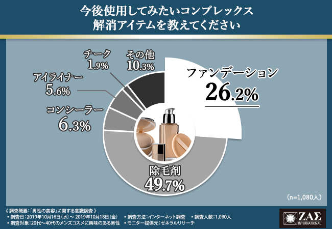 今や男性専用脱毛サロンなど、ムダ毛処理は男性にとっても当たり前の世の中ですが、コンプレックス解消のために使ってみたいアイテムとして、ファンデーションを選択した男性がおよそ4人に1人であることから、現代の男性にとって、ファンデーションなどのコンプレックス解消アイテムの使用は、当たり前になりつつあるようです。