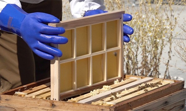 100%蜜蠟使用の巣礎を使用しコムハニー枠を手作業で作り、ミツバチの巣となる巣枠に入れます。10歳以上の方を推奨しており、安全に配慮した形での作業となります。