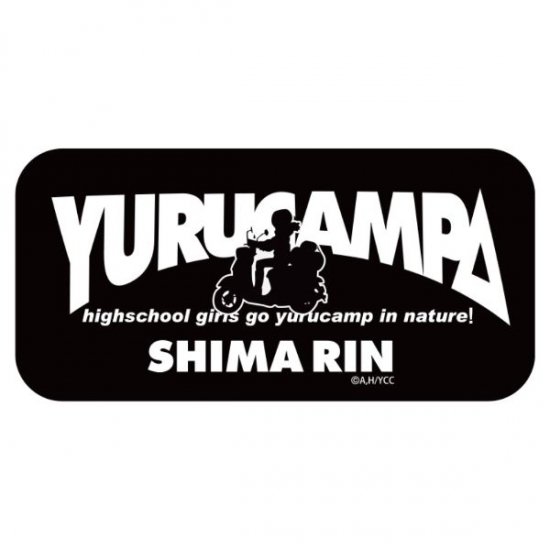ゆるキャンのロゴとともにバイクに乗るリンのシルエットがデザインされた、シンプルなステッカー。下にはリンのネームも入っています。