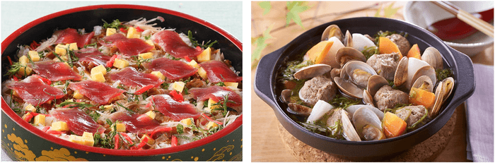 左:旅先で食べたい、ご当地の味。志摩地方の漁師飯「てこね寿司」はカツオでご用意しました。特製のタレに漬け込んだ弾力のあるカツオと酢飯に混ぜ込んだ大葉やガリが好相性の定番人気メニューです。