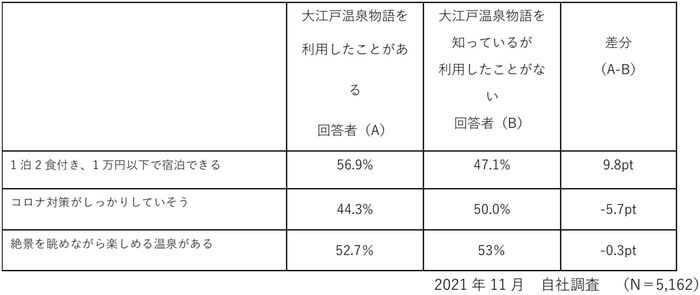 宿泊料金、安全面を心配されている方も多いコロナ対策、基本価値である温泉の3つの項目で、利用者と非利用者のスコアに差がなく、双方の利用意向を同程度に喚起した項目は
