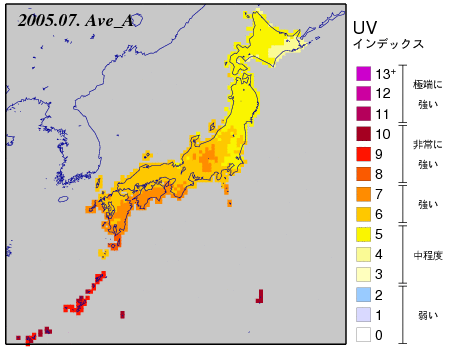 出典:「日最大UVインデックス(解析値)の月平均値全国分布図」 ※気象庁ホームページより(https://www.data.jma.go.jp/env/uvhp/link_monthly_uvindex_ana.html)