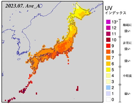 また、気象庁が調査している紫外線解析データ「日最大UVインデックス(解析値)の月平均値全国分布図」における、2005年7月調査データと2023年7月調査データを比較すると、全国的にUVインデックスが強まっていることが分かります。気温の