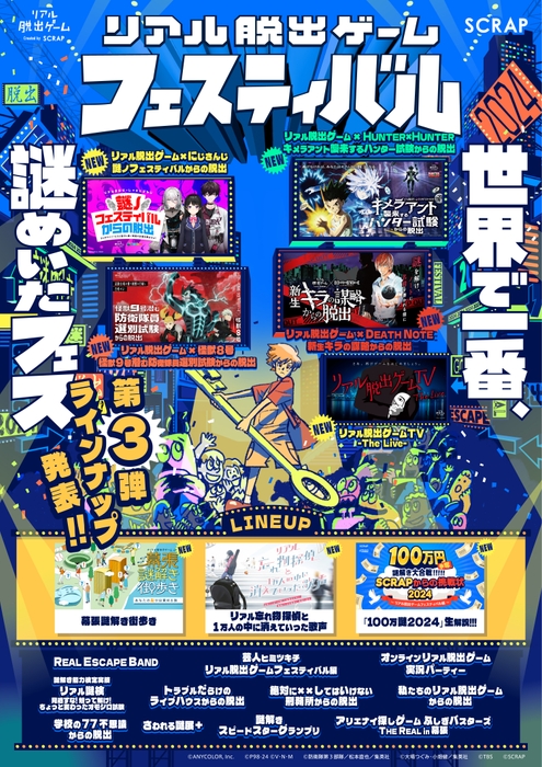 リアル脱出ゲームフェスティバル開催記念! 大人気企画『SCRAPからの挑戦状』(通称「100万謎」)が登場。「100万謎」とは、謎解きに答えて正解すると正解者の中から抽選で総額100万円が当たる、無料で挑戦可能なWEB謎解きです。出題開始は7月を予定! (詳細は後日発表) 『リアル脱出ゲームフェスティバル』では、最速で「100万謎2024」の解説と抽選を行います。今年も、解きごたえ十分の謎と抽選で当たる総額100万円をご用意しました。そして謎解き自体は最後まで無料で挑戦可能! フェスまでの腕試し、運試しで、謎解きに挑戦し、最速生解説をお楽しみください。