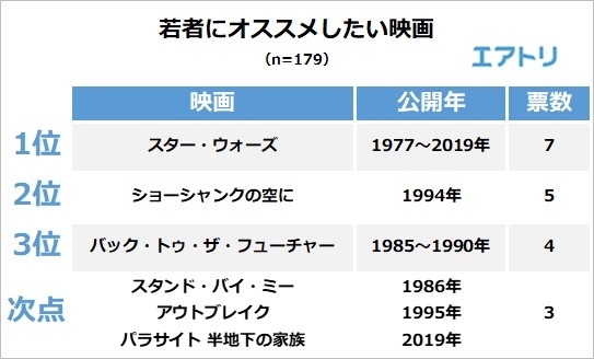 映画部門では、「スター・ウォーズ」が1位、続いて「ショーシャンクの空に」「バック・トゥ・ザ・フューチャー」が入りました。「スター・ウォーズ」「バック・トゥ・ザ・フューチャー」については「シリーズものはなかなか手が付けづらいと思うので、この機会に見てほしい」という意見が多く、「ショーシャンクの空に」については「自由な時間がどれだけ大事なことか分かるから」「人生の支えになる」など、ストーリーをオススメする意見が聞かれました。