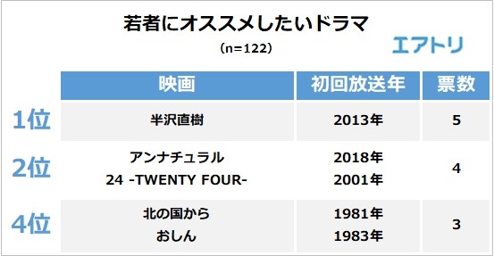 また、ドラマ部門については1位が「半沢直樹」、2位に「アンナチュラル」と海外ドラマとしては唯一の「24 -TWENTY FOUR -」がランクインしました。「半沢直樹」については「これを見て今の自分を見つめ直してほしい」といったように半沢直樹の生き様から何かを感じてほしいと願う意見が挙がりました。また、2位の「アンナチュラル」は2018年に放映された石原さとみ主演のドラマですが、第1話ではMERSコロナウイルスの感染拡大により国内がパニックになる様子が描かれており、その様子が今の状況と酷似しているとネットを中心に話題となっていることから、この作品で危機感を抱いてほしいと考えているようです。