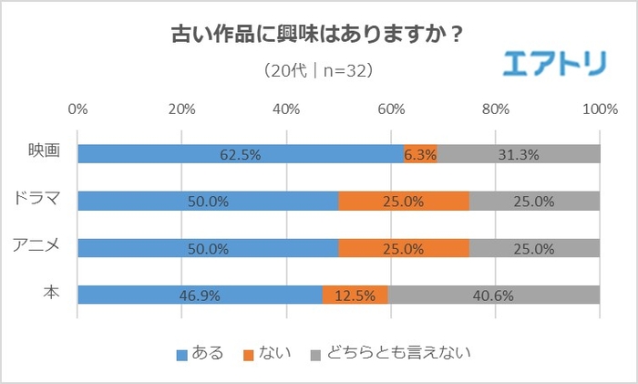 20代の人に対し、古い作品(映画・ドラマ・アニメ・本)に興味があるかどうかを聞いたところ、全てにおいて「興味がある」が多数派となりました。中でも「映画」に対しては「興味がある」が62.5%だった一方で、「興味がない」は6.3%に留まり、最も若者が興味を示していることが分かりました。