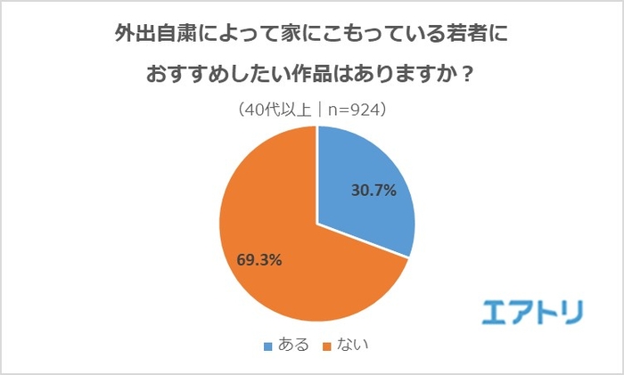 反対に、40代以上の人に対して、若者におすすめしたい作品があるかどうかを聞いたところ、30.7%の人が「ある」と回答しました。
