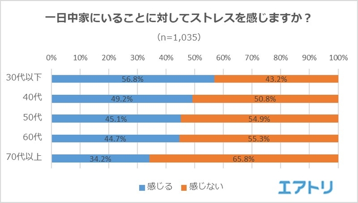 「ストレスを感じる」と回答した割合は70代以上では34.2%でしたが、30代以下では過半数の56.8%となり、若年層ほど家にいることにストレスを感じていることが分かりました。