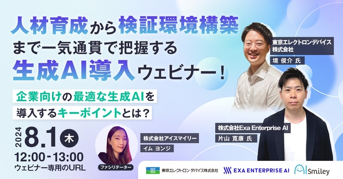 AIポータルメディア「AIsmiley」を運営するアイスマイリー(東京都渋谷区、代表取締役:板羽晃司)は、2024年8月1日(木)12時から企業向けの最適な生成AIをテーマにウェビナーを開催します。