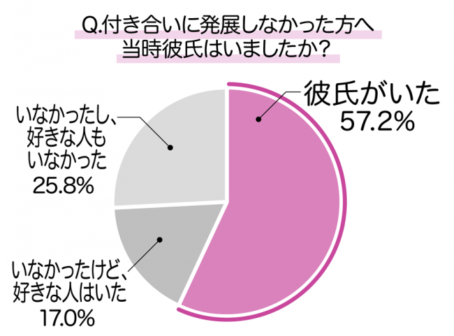 一方、「付き合うようになった」と回答した女性の半数以上が「彼氏いなかったし、好きな人もいなかった」でした。