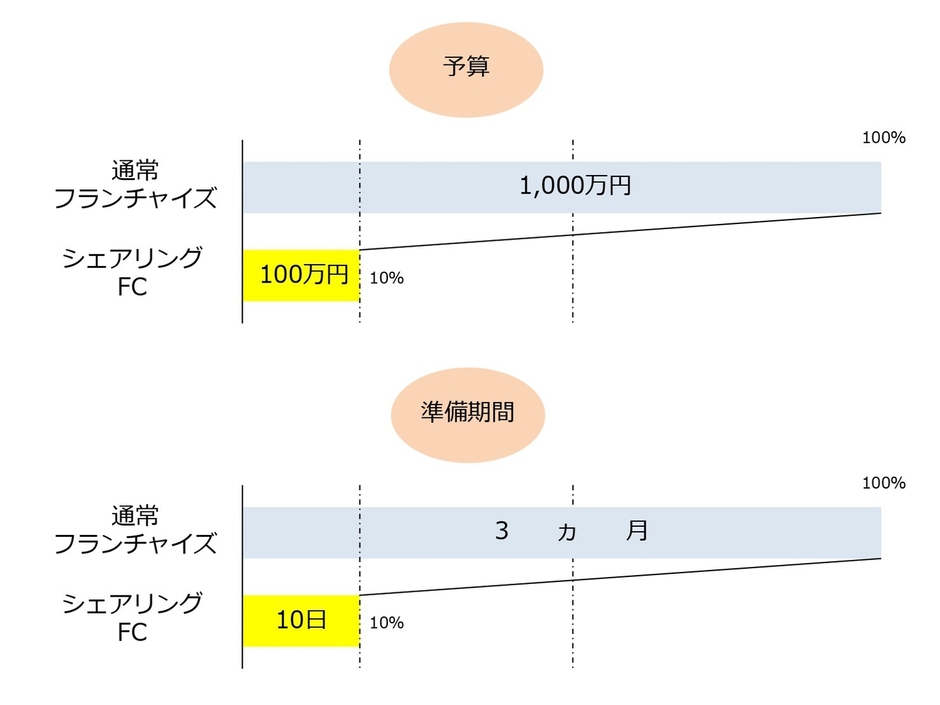 通常はフランチャイズ店舗をオープンするまでに莫大な費用(1,000万以上)と期間(最低3か月)がかかります。