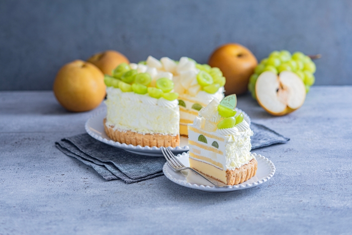 カスタードタルトにふわふわのスポンジとやさしい甘さのホイップクリームを重ね、千葉県産のみずみずしい和梨『秋満月(あきみつき)』とシャイマスカットを贅沢に使用したショートケーキタルト。