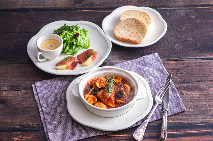 『房総ハーブ鶏と千葉県産マッシュルームのカチャトラ 秋満月と生ハムのサラダ』