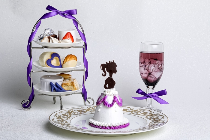 アシェットデセールには推しカラーをあしらったプリンセスイメージのドレスケーキ、ミニ三段スイーツスタンドにはプリンセスティアラ付きのモンブランやノエルガトーショコラ、推しカラーのハートアイシングクッキー、ヒールチョコなどのプチガトーとセイボリーをご用意しています。