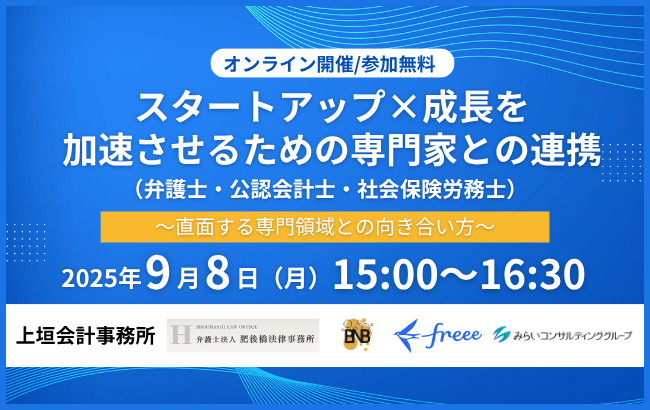 みらいコンサルティンググループ(本社:東京都中央区、代表:久保 光雄 岡⽥ 烈司)は、2025年9月8日にセミナー『スタートアップ×成長を加速させるための専門家との連携(弁護士・公認会計士・社会保険労務士)~直面する専門領域との向き合い方~』をWEBにて開催します。