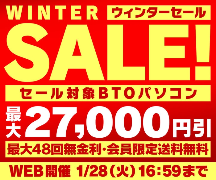 パソコン工房インターネット通販ではただいま『ウィンターセール』を2025/1/28(火)16:59まで実施中!対象BTOパソコンが最大27,000円引き!