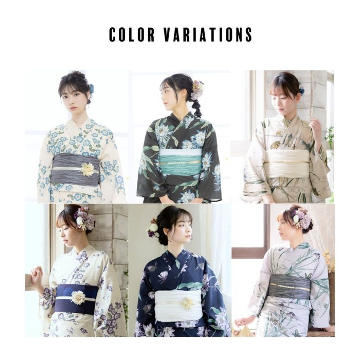 特にどれ一つとして同じ色のない地色がポイントです。一見、同じベージュやアイボリー系に見える地の色でも、グレイッシュな黄み色、やや赤みの色、わずかに緑を帯びた色などの違いがあります。現在はパーソナルカラー診断を受けるなど、より自分に調和し、魅力を引き出す色を身に着けたいという女性のニーズが高まっていますが、繊細なニュアンスカラーを地の色に使用した2024年新作浴衣は、そういった希望に応えられるコレクションとなっております。