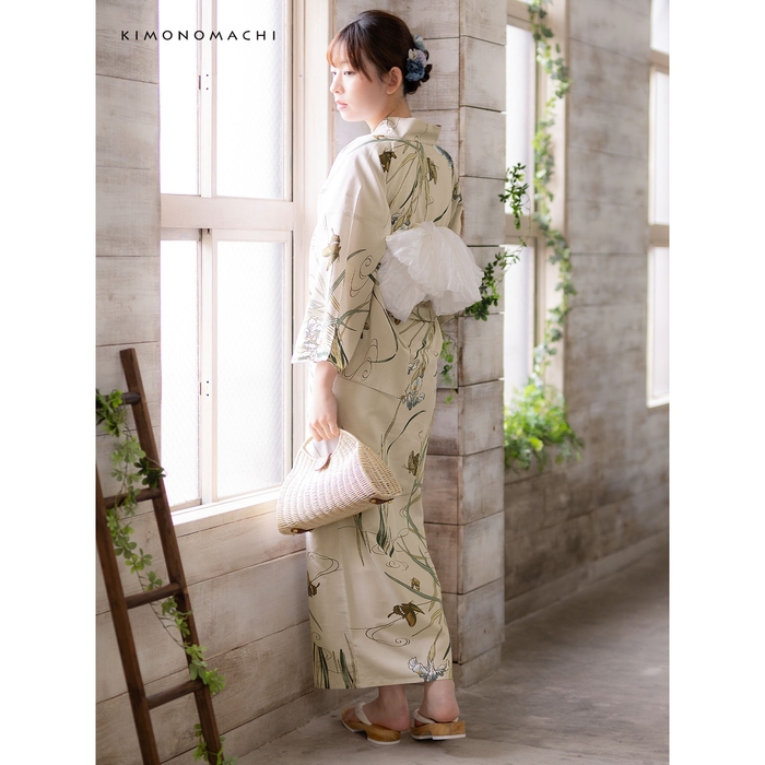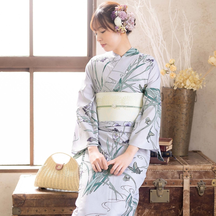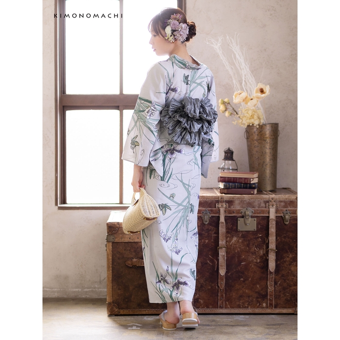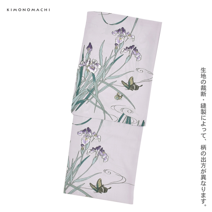 カキツバタ(燕子花/杜若)は古くから日本で愛好され、和歌や屏風絵など芸術作品のモチーフとしても取り上げられています。水辺に咲き、青紫色の美しい花を咲かせます。花びらの付け根に白い筋が入っているのがアヤメや菖蒲との違いですが、浴衣ではデザインですので白以外の挿し色が入っています。