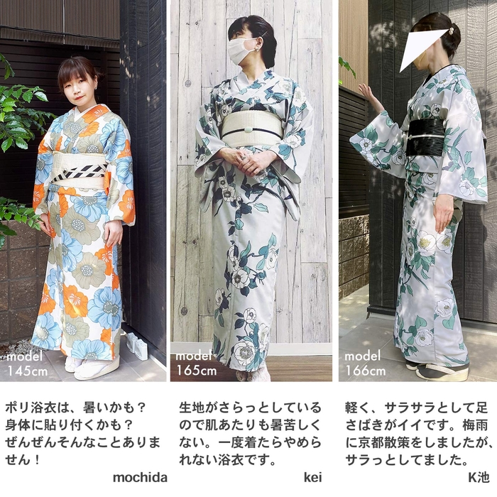 昨年までポリエステル浴衣のサイズ展開はFかLLのみでしたが、今年はサイズバリエーションを大幅に増やしました。高機能素材の浴衣を着てみたくてもサイズがない、好きなデザインなのにきれいに着られない、そんな風に残念な思いをしてきた方も、よりご自身のサイズに近い浴衣をお選びいただけるようになっています。