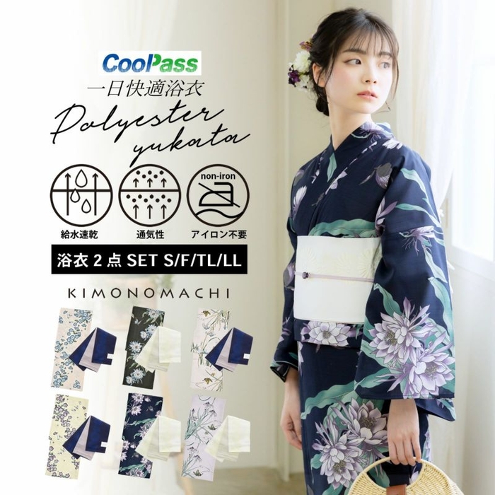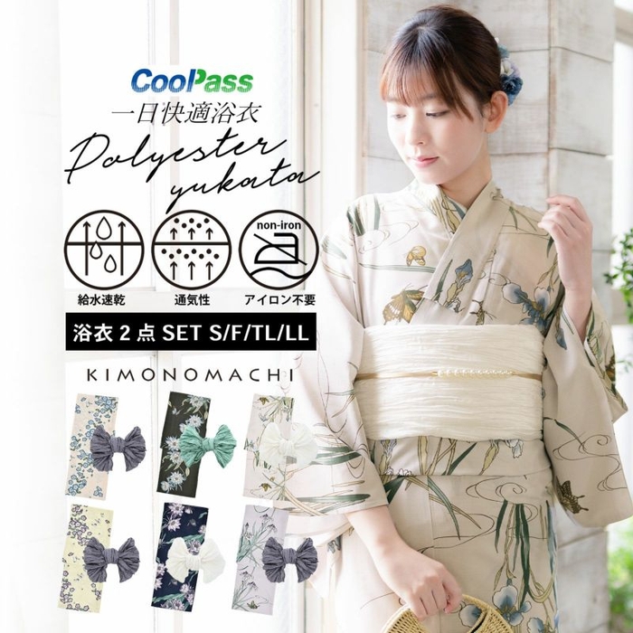 ポリエステル浴衣というと、汗がこもって蒸れやすいというイメージがありますが、吸水性、水分拡散力が高い高機能ポリエステルCoolpassは清涼感と爽快感を感じられる生地です。自宅の洗濯機で洗うことも可能で、洗濯時にもシワになりにくい優れもの。