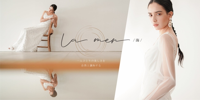 自然と調和することを大切にしており、海や緑、花畑などを舞台にしたロケーション撮影との相性がよいのが特徴。透け感のあるやわらかな素材が、風さえも味方にしてくれる。花嫁さまの、人生で最も美しい日を彩ります。