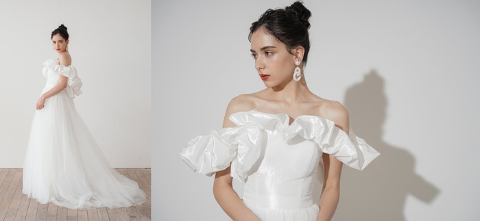 全体的なラインはシンプルでありながら、デザイン性の高いオフショルダードレス。ハイセンスの花嫁様から支持される一枚です。