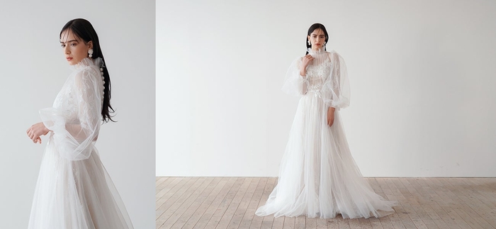 透明感のあるチュールのスタンドカラーと長袖のパフスリーブが女性らしさを出して くれる一枚。袖、上半身、スカートの内側にあるレースが高級感も演出します。