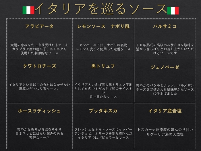 アラビアータ、レモンソース ナポリ風、バルサミコ、クワトロチーズ、黒トリュフ、ジェノベーゼ、ホースラディッシュ、プッタネスカ、イタリア産岩塩
