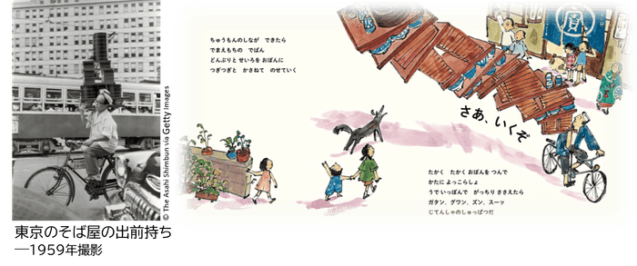 東京の自転車配達人、通称「出前」の姿と、彼らを見つめる子どもたちを描いた絵本です。湯気の立つ熱々の麺を乗せた大きなトレーを高々と重ねて肩に担ぎ、混雑した街中を颯爽と走る姿を通して、働く人の誇りや家族のぬくもり、そして街に生きる人々の息づかいがあふれています。当時の街の様子を味わえる1冊。糸井重里さん推薦。