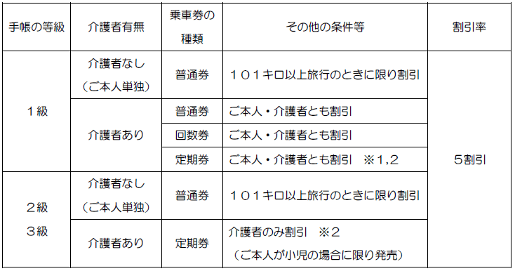 ・介護者とともに利用する場合は、購入する乗車券の種類・乗車区間・有効期間が同一で、同時にお買い求めいただき、同一の列車に乗車する場合に限り有効です。