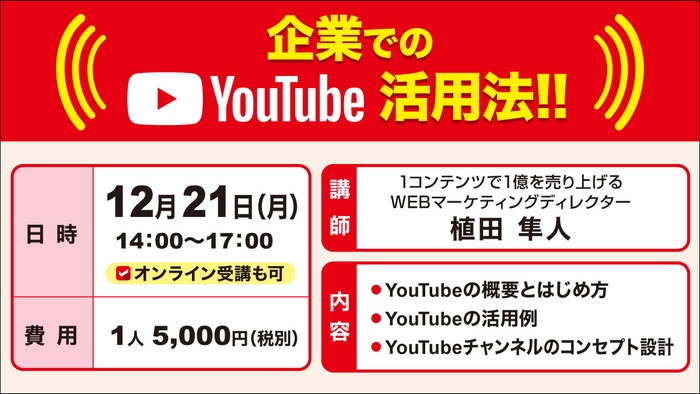 いち早く、動画を自社の売上げUPにつなげませんか。まずはYouTube媒体を知る為にお気軽にご参加ください。オンラインでの参加もできます。