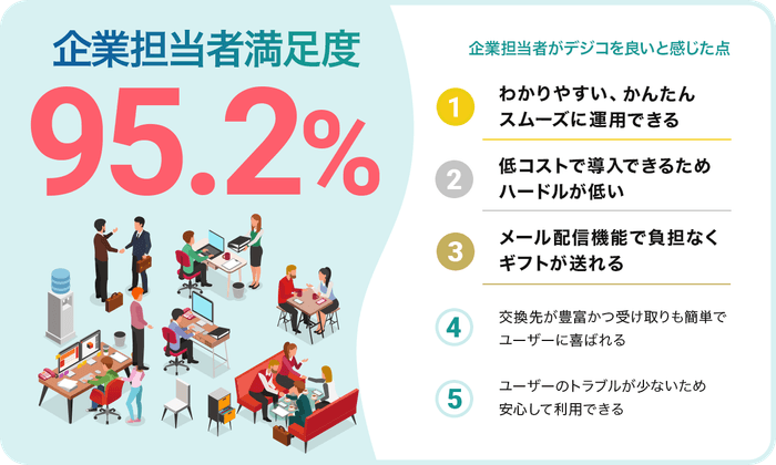 「デジコ」をご導入いただいている企業担当者に対するアンケート調査を行ったところ、企業担当者の満足度(※)は95.2%でした。また、企業担当者が「デジコ」を満足と感じた理由は以下の通りでした。
