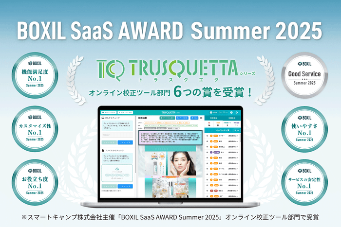 AIチェックツール「TRUSQUETTA」を提供する株式会社トラスクエタ(本社:東京都渋谷区、代表取締役CEO:高橋聡 以下、当社)は、スマートキャンプ株式会社(以下「スマートキャンプ」)が主催する「BOXIL SaaS AWARD Summer 2025」のオンライン校正ツール部門で「Good Service」「使いやすさNo.1」「サービスの安定性No.1」「機能満足度No.1」「カスタマイズ性No.1」「お役立ち度No.1」に選出されました。