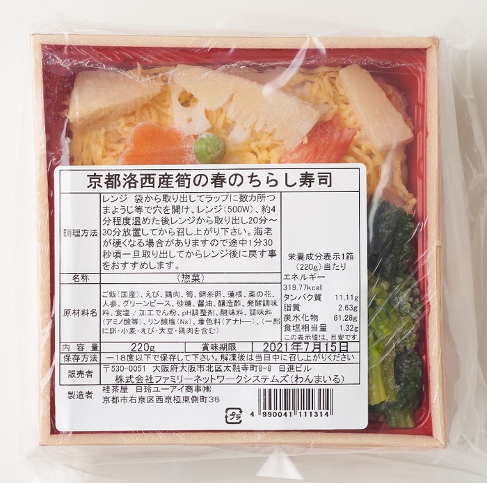 冷凍タイプのミールキット「健幸ディナー」をはじめ、レンジや湯せんで簡単に調理できる冷凍総菜を全国へ通販・宅配している「わんまいる」(運営:株式会社ファミリーネットワークシステムズ、本社:大阪市北区、代表取締役社長:堀田 茂、以下、わんまいる)は、レンジで簡単調理できる人気のちらし寿司シリーズより京都洛西産のたけのこを使用したちらし寿司を春期限定で3月1日より発売。5月中旬まで販売予定。レンジ対応の容器に入っているのでレンジするだけ。冷凍なので長期保存も可能で備蓄商品としてのニーズにも応える。
