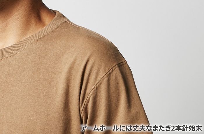 ドライタッチな質感のオープンエンド糸を高密度に編みこんだことで、力強くシャリ感のある“ラギッド”な生地に。また、洗いこむほどに生地表面の粗野感が強まり、縮みや型崩れの少ないタフ&アメリカンライクな生地へと育ちます。