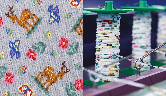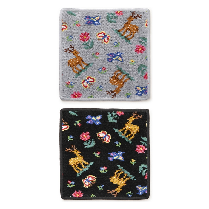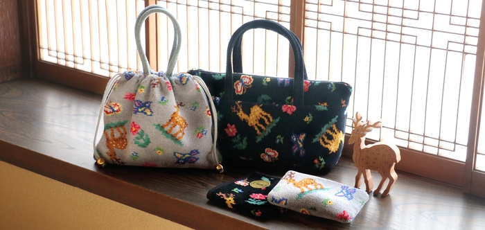 歴史と伝統に彩られたドイツ・シュニール織のブランド「フェイラー」の人気デザイン「ハイジ」をベースに、「遊 中川」のロゴにも使われている鹿や奈良の正倉院宝物に描かれた蝶や植物を、いきいきと鮮やかに織り上げたオリジナルデザインのテキスタイルを制作。