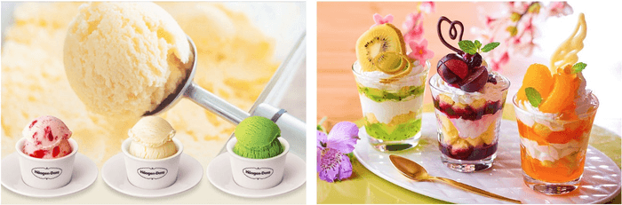右:ホテルニュー塩原もハーゲンダッツアイスクリームが食べ放題!人気のバニラ、ストロベリーとクッキー&クリームの3種類をご用意いたしました。好きなだけスクープして、何度でもおかわりができるのはバイキングならではの醍醐味。