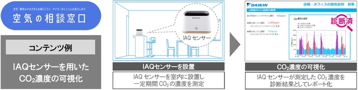 さらに、当社が2020年6月1日に業界に先駆けて開設した『空気の相談窓口』に全国から寄せられる相談への対応も強化します。主に業務用空間の換気を対象に開設した『空気の相談窓口』には、これまでに店舗やオフィス、クリニックなどを中心に約5,000件の相談が寄せられました。業務用空間の換気は住宅よりも複雑で、電話だけではお客様の困りごとを把握しづらく、現場の確認が必要になるなど、お客様への回答に時間を要するケースが多いことが分かりました。そのため、2021年4月1日より、よりスムーズな回答をめざした取り組みを開始します。具体的には、相談内容に類似した事例の紹介や、IAQセンサーを用いてCO2濃度を可視化できるコンテンツを展開します。また、当社商品の販売を担う全国10カ所のグループ会社に相談対応の専任者を配置し、地域に寄り添い、きめ細かく対応します。