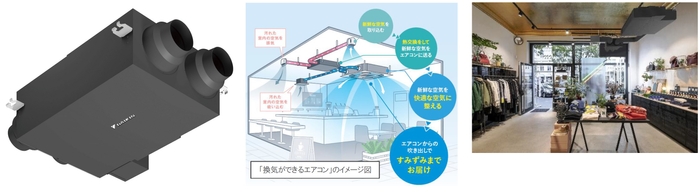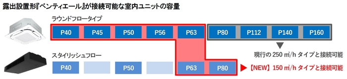 露出設置形『ベンティエール』とエアコンの室内機(ラウンドフローおよびスタイリッシュフロー)をダクトで接続することで、夏でも冬でも屋外から取り入れた新鮮な空気を快適な温度にしながら室内全体に届けることができ、業務用においても「換気ができるエアコン」を実現します。150㎥/hタイプを発売することで、小さい空間に適した小容量タイプの室内機との接続が可能になります。