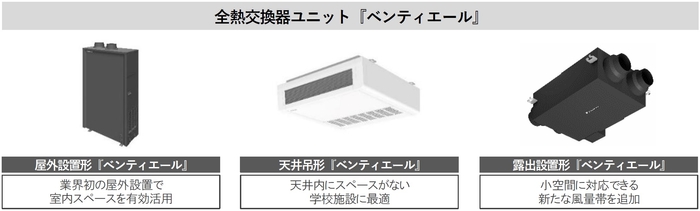 従来の全熱交換器ユニット『ベンティエール』は天井内への埋め込み設置が主流で、既存の建物に追加で設置する場合には天井の張替工事が伴うなど、導入のしづらさに課題がありました。昨年来、小規模な店舗や事務所、学校などでも従来以上に効果的な「換気」が求められている中、当社は2020年9月に、建物の内壁や天井、軒下などに比較的容易に後付け設置することができる露出設置形『ベンティエール』を発売しました。このたび『ベンティエール』に、業界初(※1)となる屋外設置が可能な「屋外設置形」、天井内にスペースがない学校等への後付けに適した「天井吊形」、小空間にも対応可能な「露出設置形(150㎥/hタイプ)」の3商品を新たにラインアップし、従来と異なる設置方法や新たな換気量シリーズの拡充で設置の自由度をさらに拡大します。機器本体やダクトの設置スペースが確保できない等の理由で設置が難しかった場所への導入を可能にし、様々な用途の業務用空間において、快適性、省エネ性を維持しながら効率的な換気ができます。