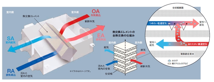 1.熱交換エレメントを搭載し、換気に伴う室内の温度や湿度の変化を軽減